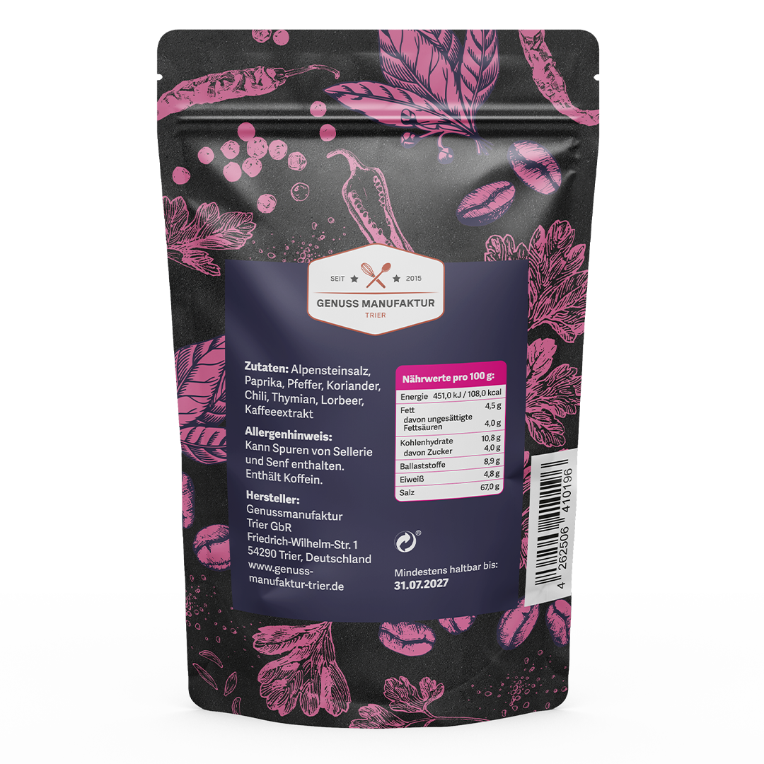 Alpensteinsalz, Paprika, Pfeffer, Koriander, Kaffeeextrakt, Chili, Thymian, Lorbeer. Enthält Koffein.