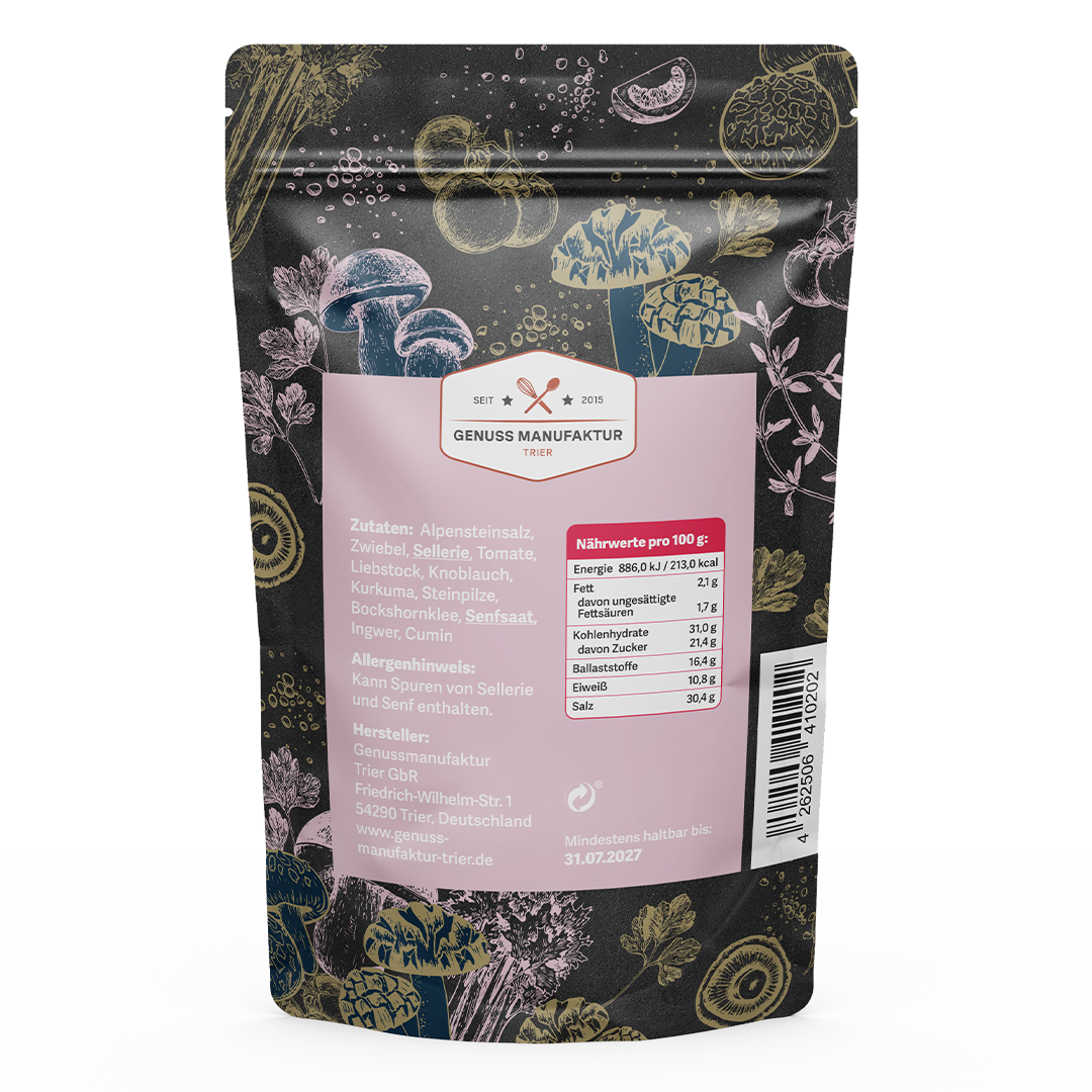 Alpensteinsalz, Zwiebel, Sellerie, Tomate, Liebstock, Knoblauch, Curcuma, Steinpilze, Bockshornklee, Senfsaat, Ingwer, Cumin
