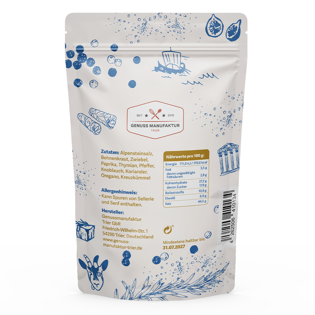 Alpensteinsalz, Bohnenkraut, Paprika, Thymian, Pfeffer, Knoblauch, Koriandersaat, Oregano, Kreuzkümmel