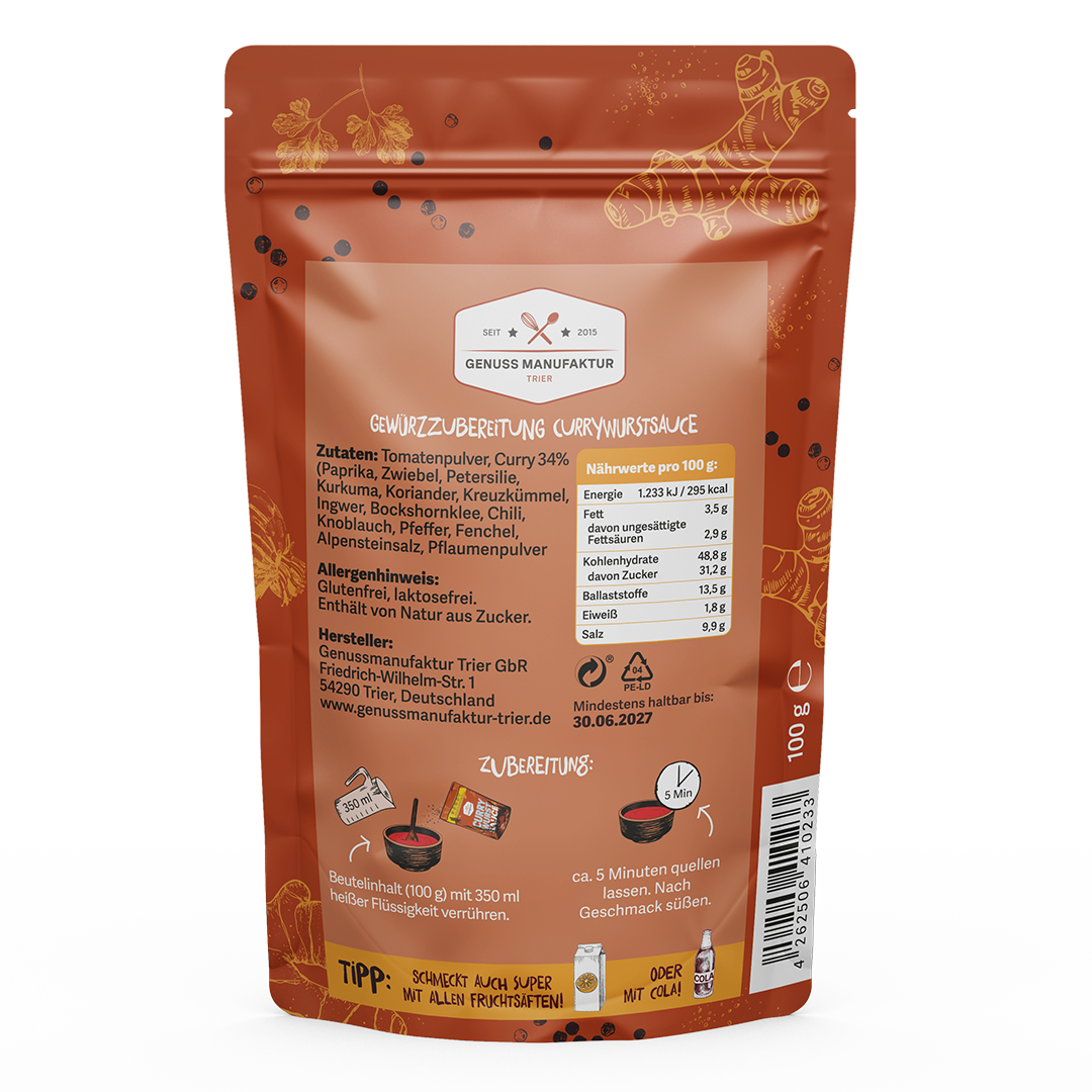Zutaten: Tomatenpulver, Curry, Paprika, Zwiebel, Petersilie, Curcuma, Koriander, Kreuzkümmel, Ingwer, Bockshornklee, Chili, Knoblauch, Pfeffer, Fenchel, Alpensteinsalz, Pflaumenpulver