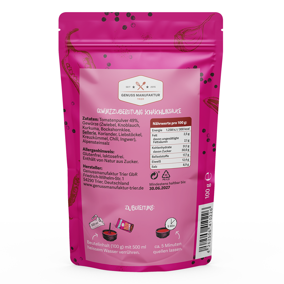 Zutaten: Tomatenpulver, Zwiebel, Knoblauch, Kurkuma, Bockshornklee, Sellerie, Koriander, Liebstöckel, Kreuzkümmel, Chili, Ingwer, Alpensteinsalz